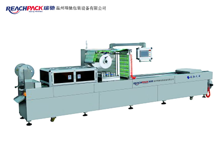 真空作業的一起,二位三通電磁閥IDT作業,熱封氣室真空,熱壓架堅持原位。拉伸膜包裝機選用接連步進的方式,根據需求,裝填可由人工或機械完成。下卷膜經牽引以定歩距步進,經預熱區和加熱區,由氣壓、真空或沖模成型,裝填區填充物料后,進入熱封區。熱封區中,上卷膜經導輥后覆蓋在成型盒上。視包裝需求,可進行抽真空或充入保護氣體的處置,然后進行熱壓封合。